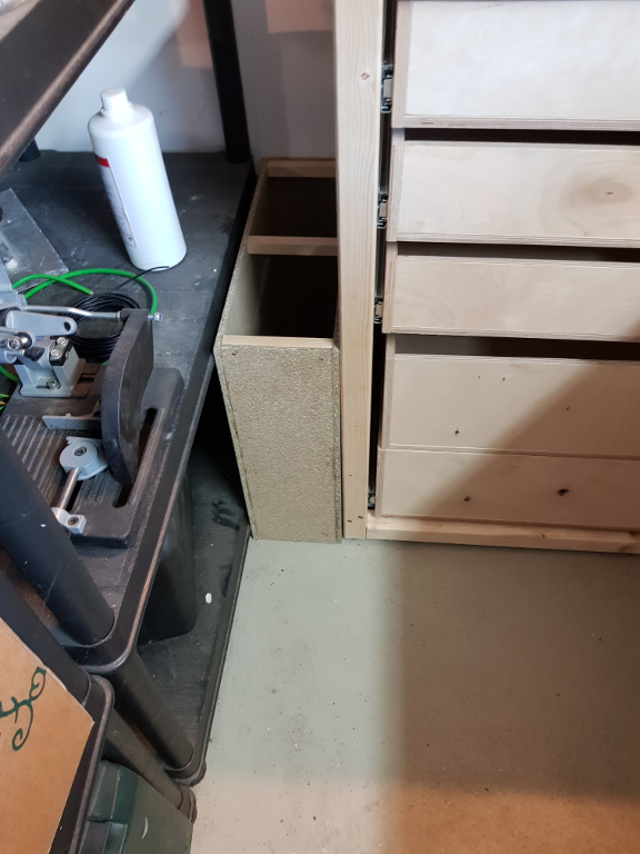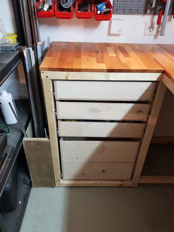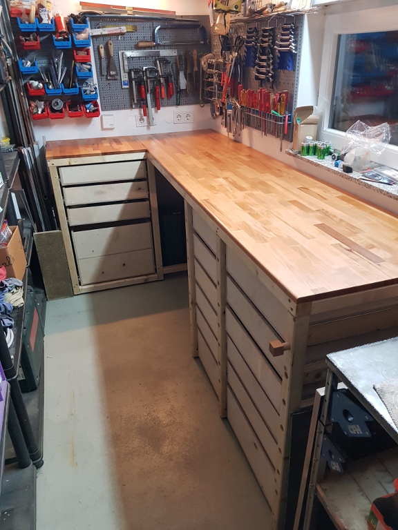 So, fast fertig. Der Bereich, in dem keine Schubladen angebracht sind, ist als Parkposition für den noch zu bauenden Werkstattwagen gedacht. Der Wagen soll dann hier in die Werkbank integriert und eingeschoben werden.