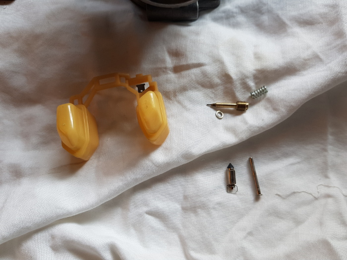 Als nächstes kommen die Schwimmer, samt Bolzen und Schwimmerventil sowie die Gemischschraube mit Feder, Unterlegscheibe und der Gummidichtung (hier nicht auf dem Foto). Wichtig ist natürlich, dass die Schwimmer einwandfrei dicht sind und keine Risse aufweisen. Ansonsten wird der Vergaser an Inkontinenz leiden und das Mopäd schnell unter sich machen.