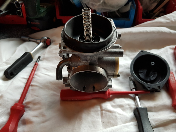 In die Führung der Membran die Vergasernadel (vorher die Unterlegscheibe) einsetzen. Membranfeder oden aufsetzen und dann schön vorsichtig den Deckel aufsetzen. Unbedingt darauf achten, dass die Membran im Deckel am Gehäuse gleitet und nicht durch den Deckel gequetscht oder gefaltet wird. Dann lässt sich der Vergaser nicht einstellen.
