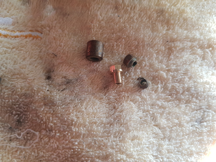 Dabei war die Schraube noch nicht einmal fest. Beim Anziehen einer der unteren Schrauben eines Vergasernadelstocks hat sich die Schraube endgültig verabschiedet. Die 24 Jahre haben einfach ihre Zeichen der Zeit hinterlassen. Die Schraube war so marode, dass sich sogar die einzelnen Gewindestiege gelöst haben (siehe Foto).