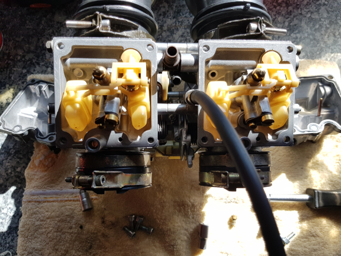 Also die Schwimmerkammerdeckel noch einmal abgenommen, die neuen Schrauben auf die Vergasernadelstöcke (inkl. Distanzstück) und Vergaser wieder zu!