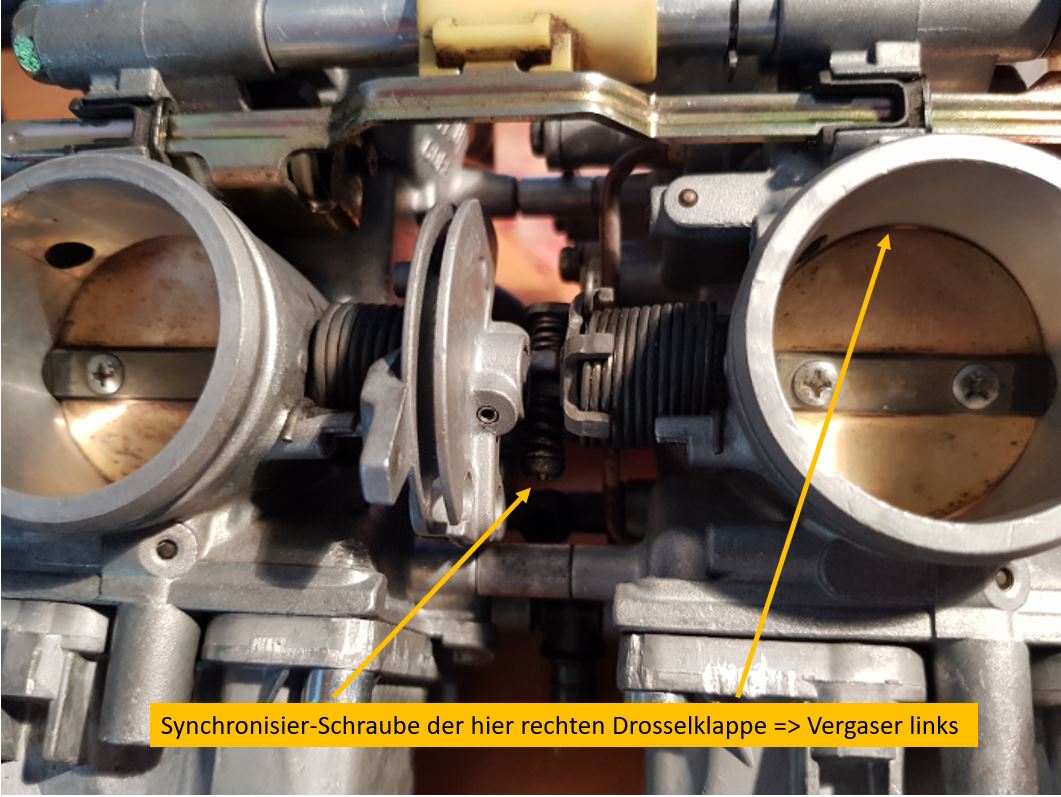Unabhängig davon, ob man den Vergaser komplett zerlegt hatte oder man die Vergaser nur neu einstellen möchte, gibt es bei der TDM 850 (3VD) 4 Schrauben, die relevant für die Einstellung bzw. Synchronisation sind.
