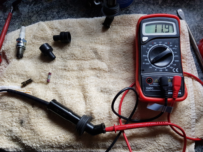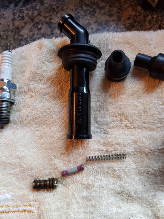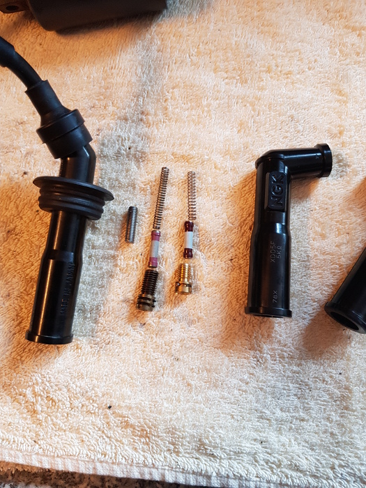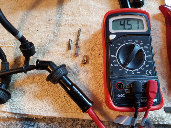 Mit dem neuen Innenleben hat der Kerzenstecker jetzt 4,5 kOhm (der ander hat 5,1 kOhm). Inkl. der Zündkerze liege ich dann bei ca. 10 kOhm und bin weit weg von 15 kOhm. Das Motorrad läuft damit einwandfrei und ist super angesprungen!