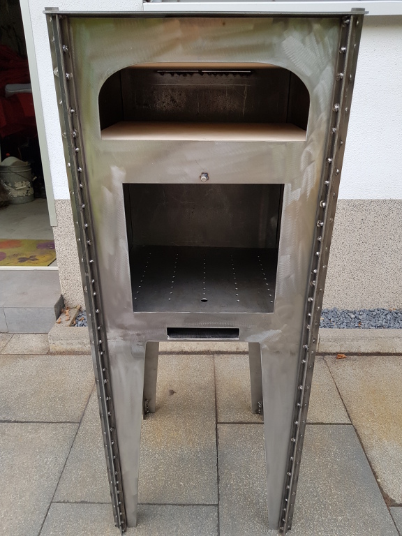 - 1 Brennraum (verschließbar) sowie eine Kammer mit Pizzasteinen zum Backen