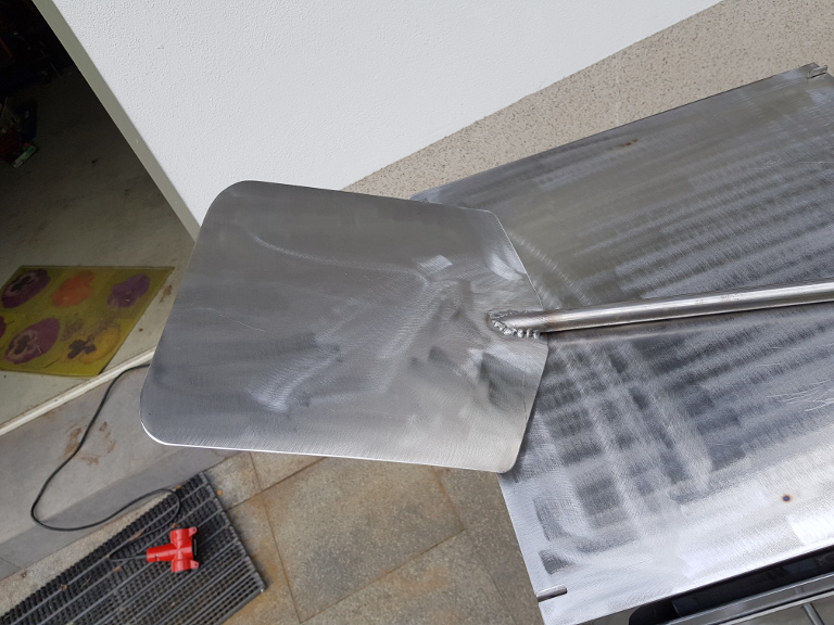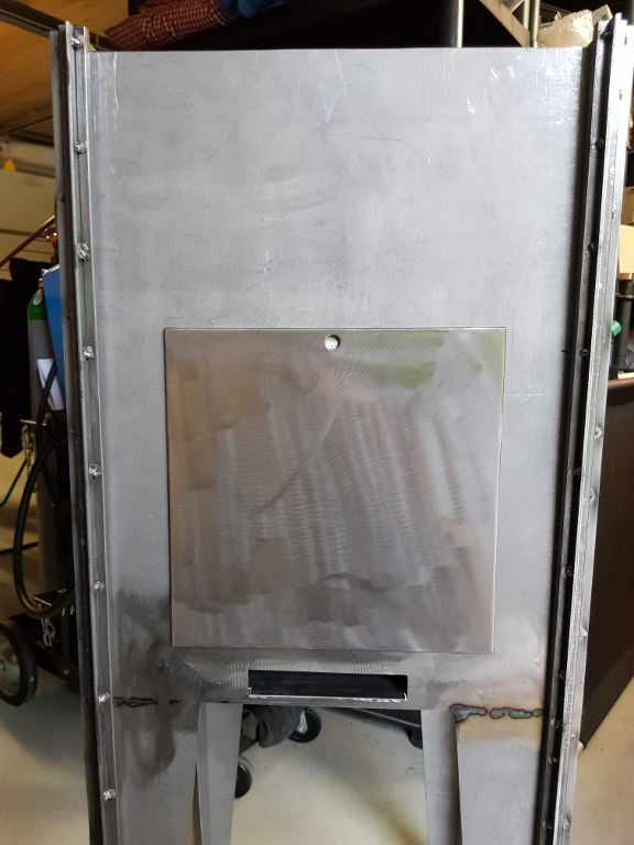 Verschlussklappe muss sein. Hier im Bild erst einmal von hinten mit einem Magneten gehalten. Final habe ich einfach ein 8 mm Rundstück an die Front geschweißt, an der die Klappe einfach nur eingehängt wird. Fehlt nur noch ein Griff.