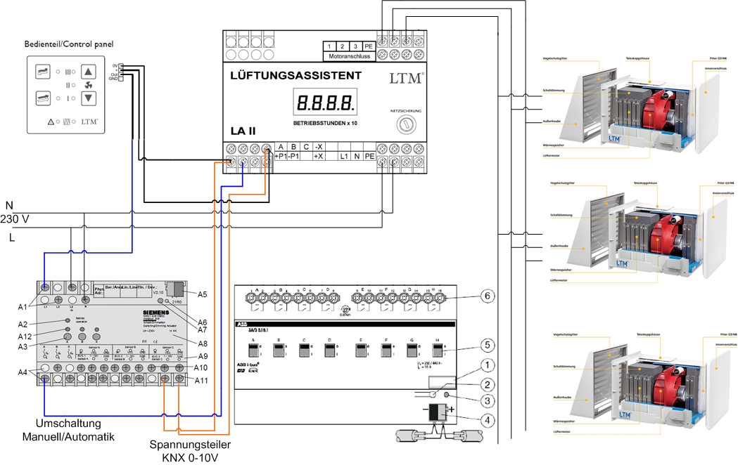 Die Steuerungskomponente der Anlage - Lüftungsassistent LA II - wird über das Bedienteil/Control Panel mit einer Gleichspannung 0 - 10 V angesteuert. Diese 10 V liefert der LA II über den Anschluss +P1.