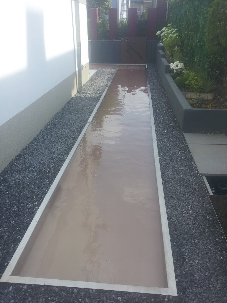 Irgendwann sind wir dann eher zufällig auf die Idee eines Edelstahlbeckens gekommen. Nachdem wir uns mit dem Gedanken einigermaßen angefreundet hatten, haben wir uns ein kleines Becken von ca. 2,5 m Länge, 50 cm Breite und 20 cm Höhe anfertigen lassen, um einen Eindruck von einem derartigen Becken zu bekommen. Bei dem Edelstahl-Profi unseres Vertrauens hat auch der Preis gestimmt, so dass es eine wirkliche Alternative dargestellt hat.