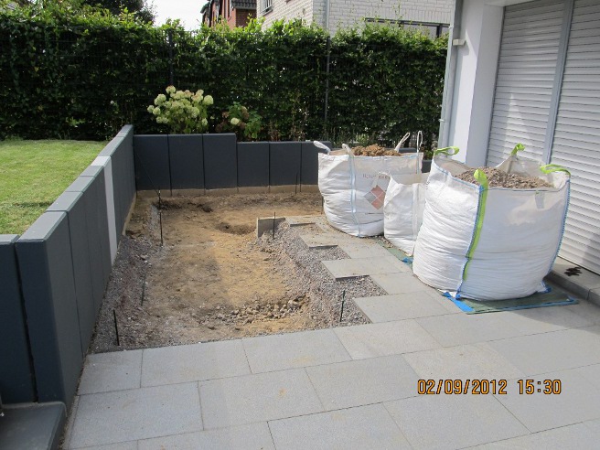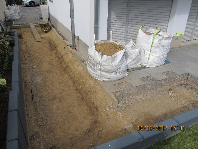 Zur Lagerung der Erde, des Schotters und Splits eignen sich Big-Packs, die es überall gibt. Da es von vornherein klar war, dass die Lagerung über mehrere Monate dauern würde, konnte dadurch verhindert werden, dass der Regen den Dreck überall hin transportiert.