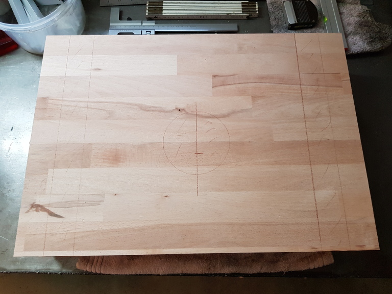 Auf die Platte wurden die entsprechenden Ausschnitte, Nuten und Bohrungen angezeichnet. Grundlage für die Maße sind natürlich die Abmessungen der Standbohrmaschine.