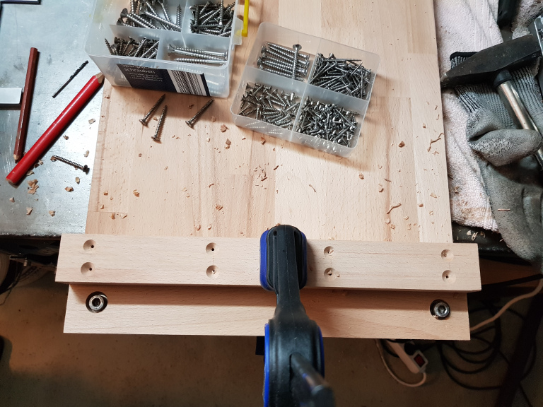 Das Zwischenkonstrukt muss natürlich mindestens so stark sein, wie der eigentliche Bohrtisch der Standbohrmaschine. Daher werden hier die 18mm und 27mm Leisten miteinander verschraubt. In der 18mm (80mm Breite) wurden lediglich Löcher für die spätere Verschraubung mit der Bodenplatte eingebracht. Zustäzlich wurden noch - das Material ist ja stark genug - Möglichkeiten geschaffen um die Schraubenköpfe (Innensechskant) zu versenken.