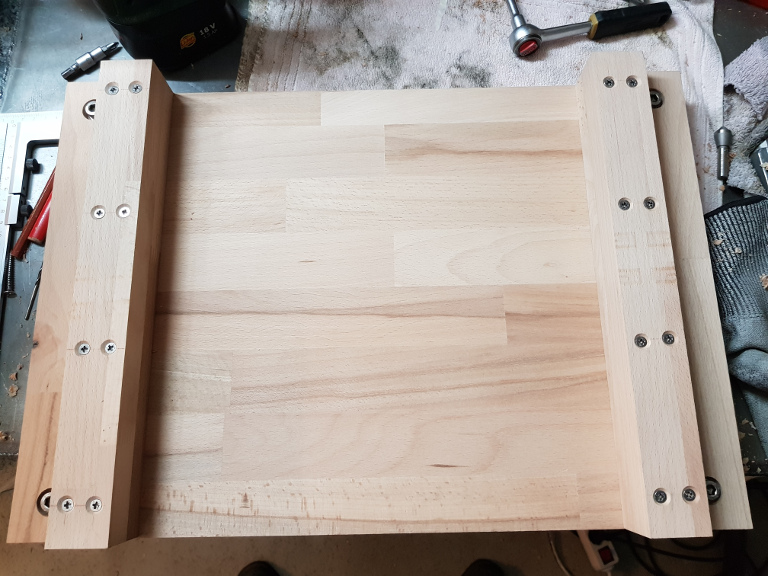 Wenn beide Seiten fertig verschraubt sind, kann zumindest einmal provisorisch die Arbeitsplatte positioniert werden.
