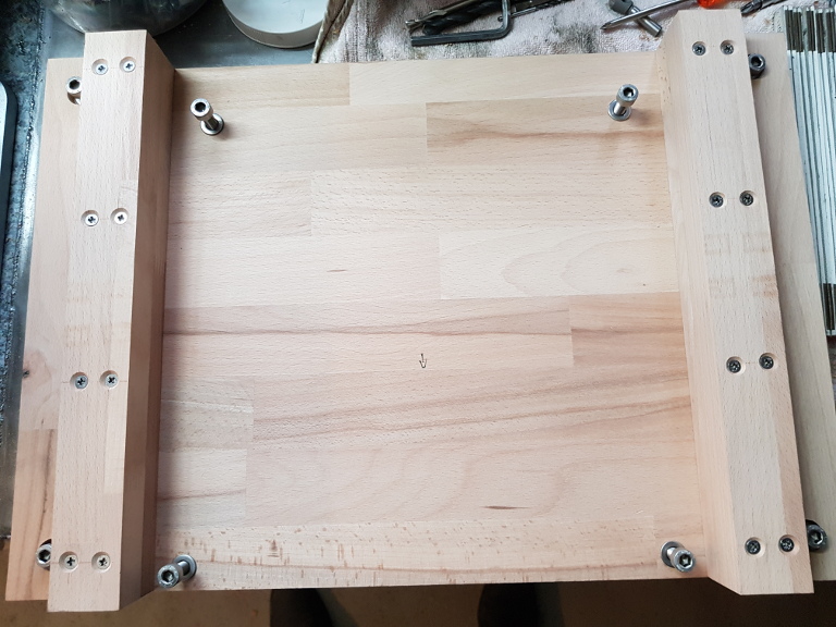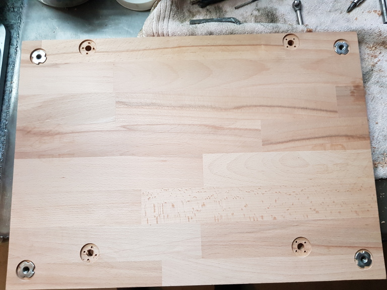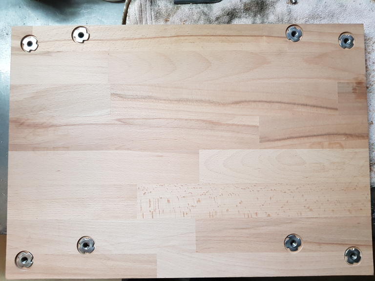 An der Bodenplatte wurden Löcher angebracht, um die Zwischenplatten mit der Bodenplatte zu verschrauben. Unter der Platte wurden die Löcher eingefast, um Einschlagmuttern anzubringen. Wichtig: Die Einschlagmuttern haben kleine Spitzen, um sie halt einzuschlagen. Es ist empfehlenswert, die Muttern kurz anzudrücken und die Stellen, an denen die Spitzen ins Holz gehen mit einem sehr dünnen Bohrer (2mm) vorzubohren. Das verhindert, dass das Holz beim Einschlagen der Mutter splittert!
