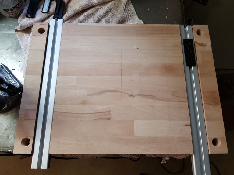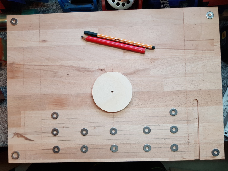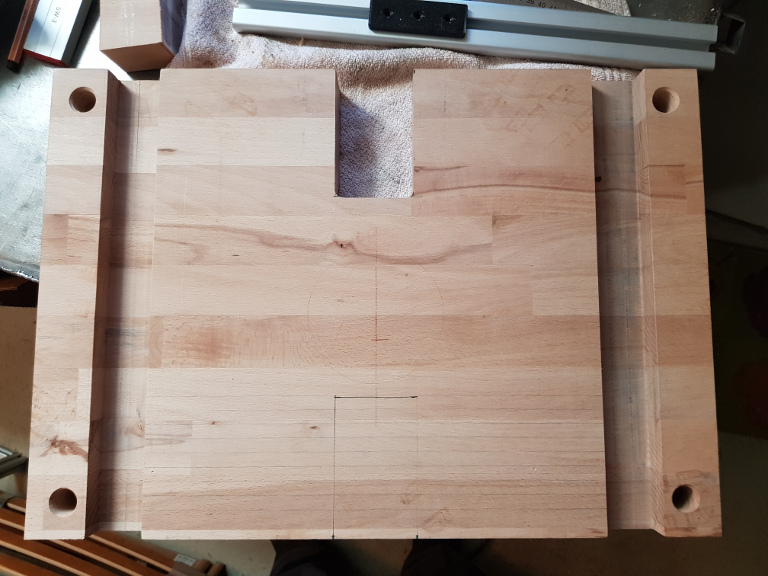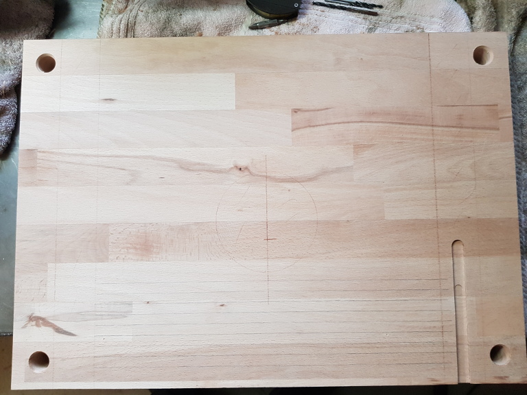 Hier im Folgenden mal ein Ausblick, wo und wie die Bohrungen auf der Arbeitsplatte angebracht werden sollen. Die Bohrungen an den Ecken dienen dazu, an die Schrauben der darunter liegenden Befestigung mit der Bodenplatte zu kommen.