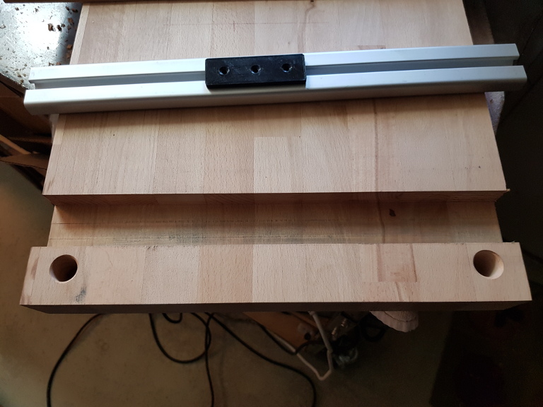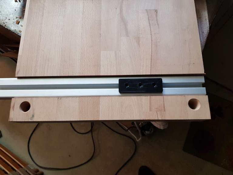 Nute für die Aluschien gefräßt. Die Aluschiene muss nur noch auf die Länge der Holzplatte gekürzt werden.