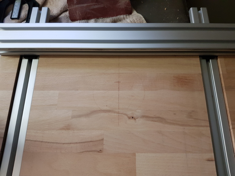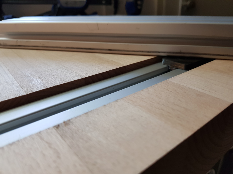 Die Tiefe der Nut muss exakt mit der Höhe der Aluschiene plus der Dicke der Gleitschiene übereinstimmen. Grund ist, dass auf die Gleitschiene das Aluprofil aufgeschraubt wird und das Profil direkt auf der Buchenholzplatte aufliegt.