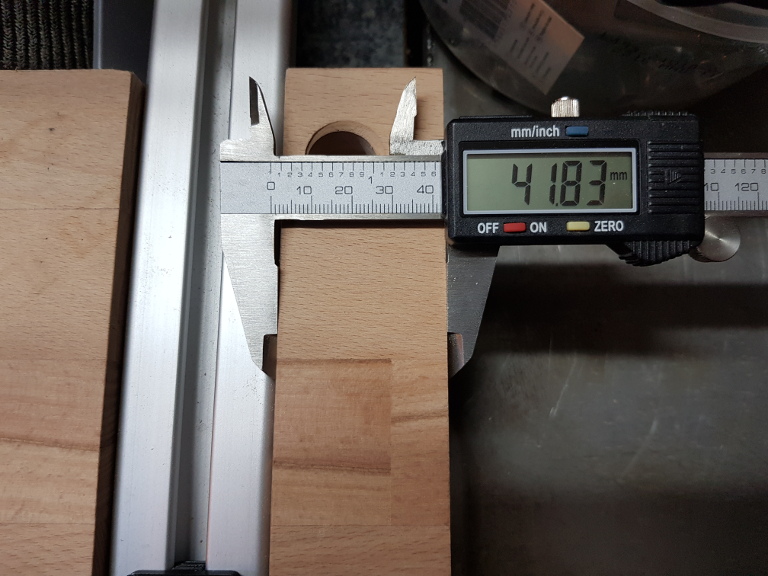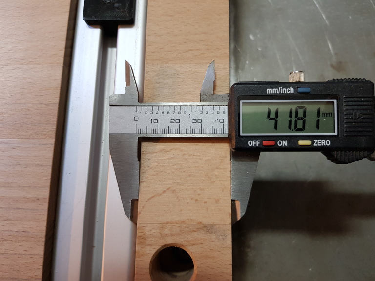 Eigentlich war geplant, den Rand 42mm zu machen, aber 2/10 Abweichung ist vollkommen akzeptabel. Außerdem ist auch viel wichtiger, dass die Nut parallel zum Rand gefräßt ist und da können sich 2/100 doch sehen lassen.