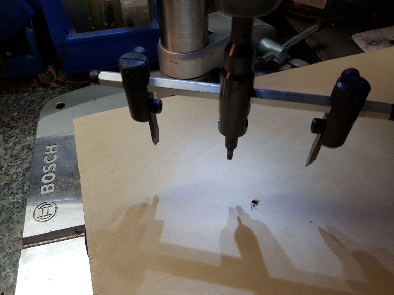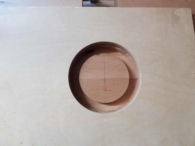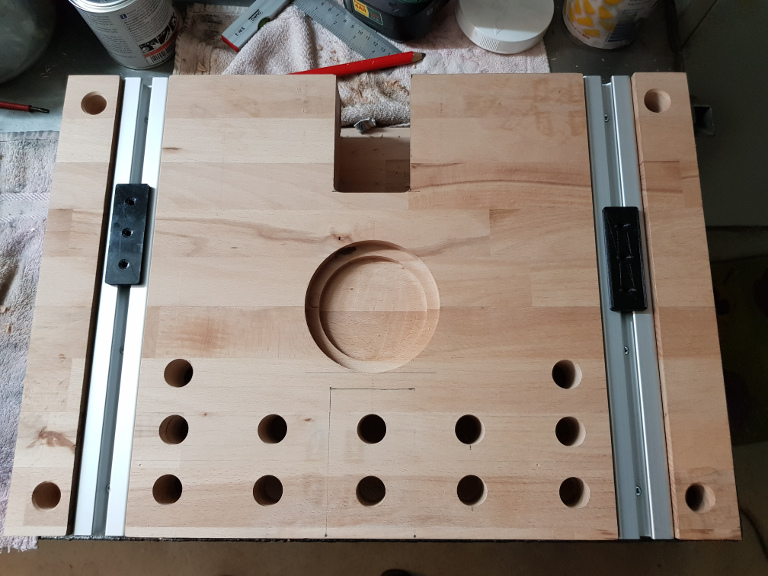 Die Ausfräsung in der Arbeitsplatte soll 100mm Durchmesser betragen und für Opferplatten von 12mm Stärke gedacht sein.