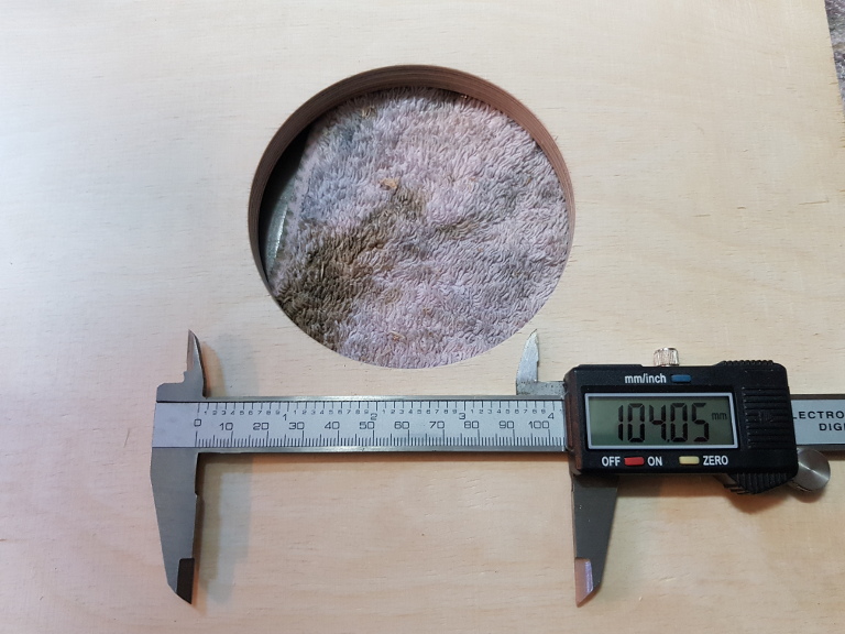 Mit der Schablone von 104mm (Loch-)Durchmesser kann mit einem 16mm Kopierring (der Makita-Fräse) und einem 8mm Fräser ein 100mm Kreis in der darunter liegenden Platte gefräßt werden. In diesem Fall mit einer Tiefe von 12mm (versteht sich), basierend auf der Plattenstärke der Opferplatte.