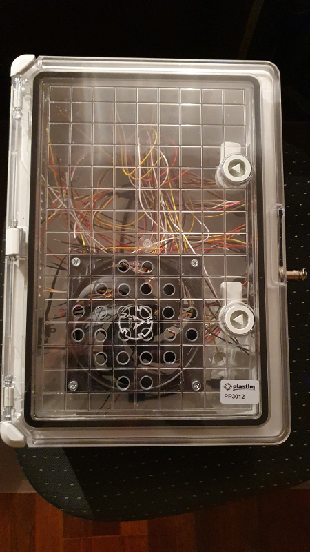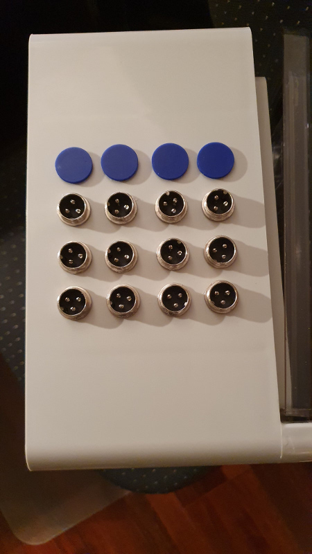 Auf der Oberseite des Gehäuses habe ich alle Eingänge (Stecker) angebracht. Es sei gesagt, dass es max. 16 Eingänge gibt, ich jedoch hier nur 12 Eingänge nach Außen geführt habe. Aktuell benötige ich davon 8 Eingänge und mit hoher Wahrscheinlichkeit wird es in absehbarer Zeit auch dabei bleiben.