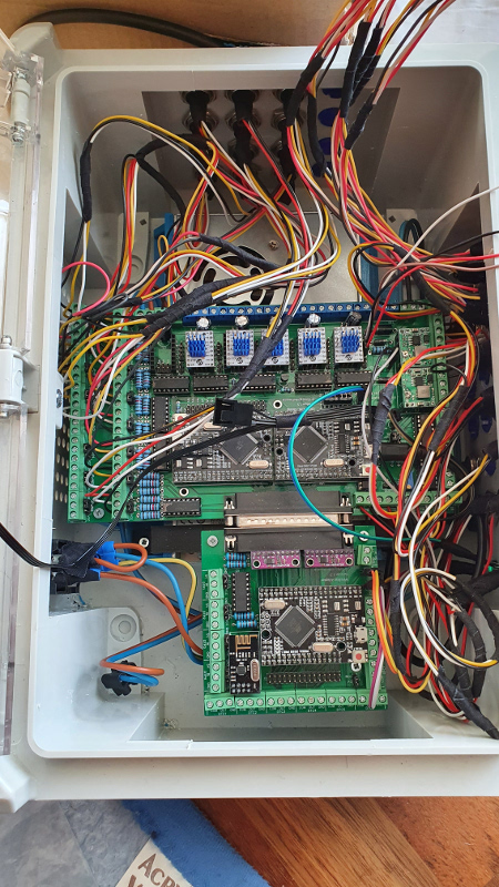 Die untere Reihe enthält dann alle LEDs, die von den Platinen nach Außen geführt wurden. Die LEDs sind von der OPEN-CNC-Shield-Platine sowie vom Wireless Adapter.