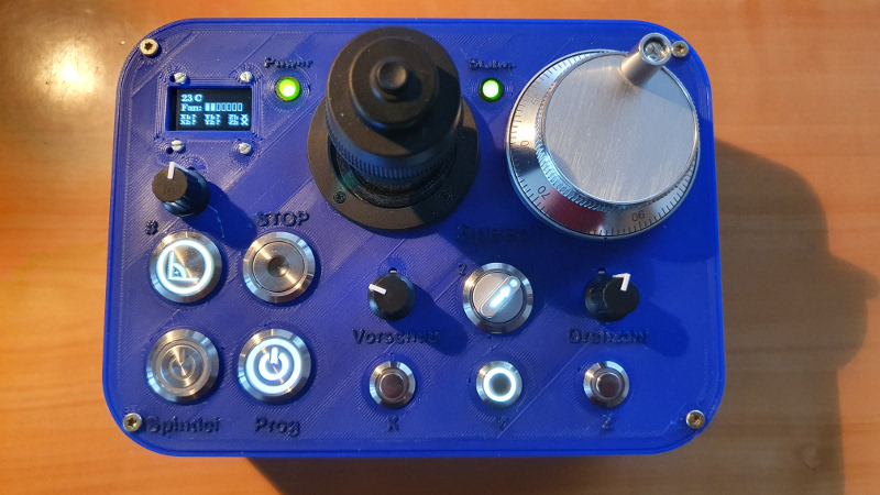 - Knopf zum Starten der Spindel (momentan für meine Fräse nicht im Einsatz)