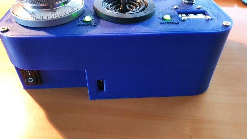 Als Batterie/Akku dient eine Powerbank, die über USB den Controller im Inneren versorgt und per Schalter aus-/ein geschaltet werden kann. Zusätzlich kann die Powerbank über eine Öffnung an der Rückseite an ein Ladekabel angeschlossen werden, so dass das Gehäuse nicht immer geöffnet werden muss.