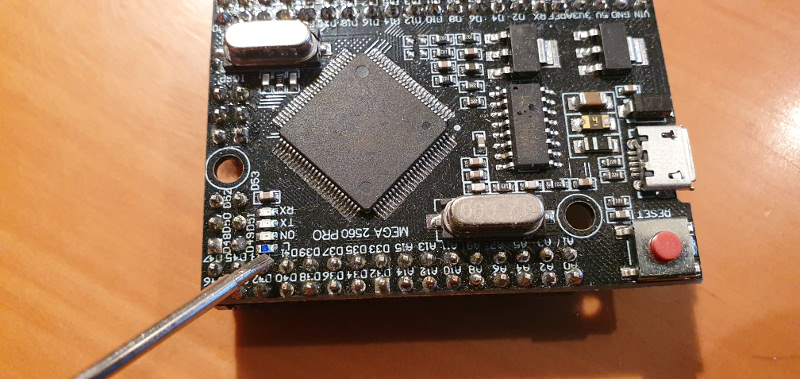 Normalerweise ja kein Problem, auch wenn die Eingänge fest vorgegeben sind. Es gibt jedoch einen Effekt, der sich hier recht unschön äußert. Der Arduino Mega nutzt den Eingang 8 (Pin 13) für die interne LED und damit ist dieser Eingang normalerweise blockiert. Könnte man einen anderen Eingang nutzen, wäre das Problem lediglich, dass 1 Eingang weniger zur Verfügung stünde. In diesem Fall jedoch nicht. Für AutoSquaring muss definitiv der Eingang 8 genutzt werden ... und das heißt, man muss die interne LED auf dem Arduino "zerstören" bzw. auslöten.
