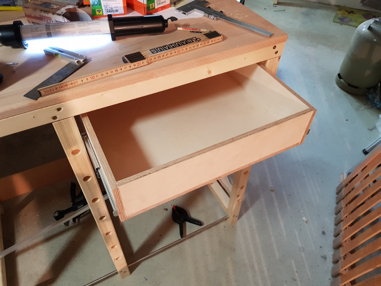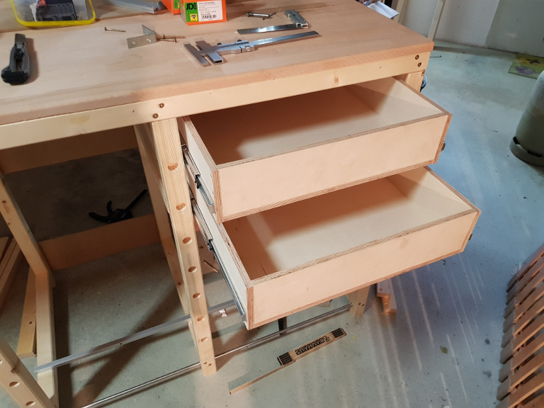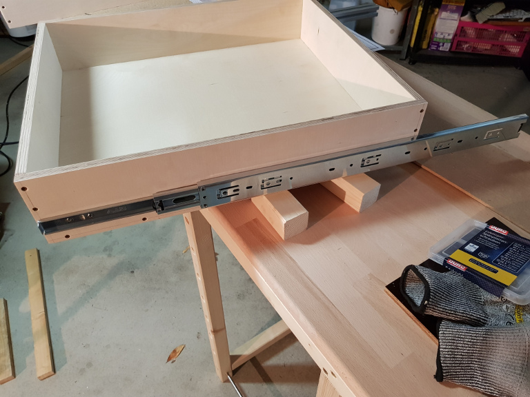 Nach Anbringen der Schubladenschiene. Die Schiene wurde ca. 30-35mm vom unteren Rand der Schublade befestigt. Dies muss natürlich mit den Leisten abgestimmt sein, die zwischen den vorderen und hinteren Pfosten der Werkbank angebracht werden.