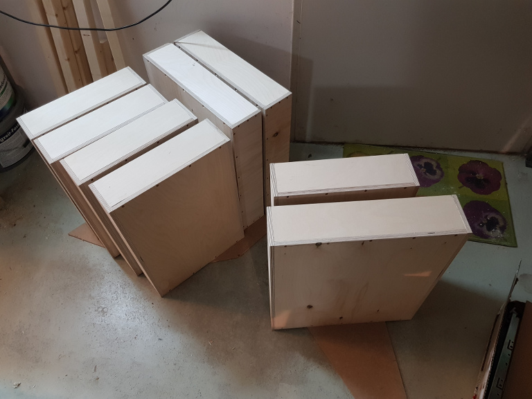Fertigstellung der Schubladen, hier bereits auch die unterschiedlichen Breiten, da die Pfosten ja auch unterschiedliche Abstände haben.