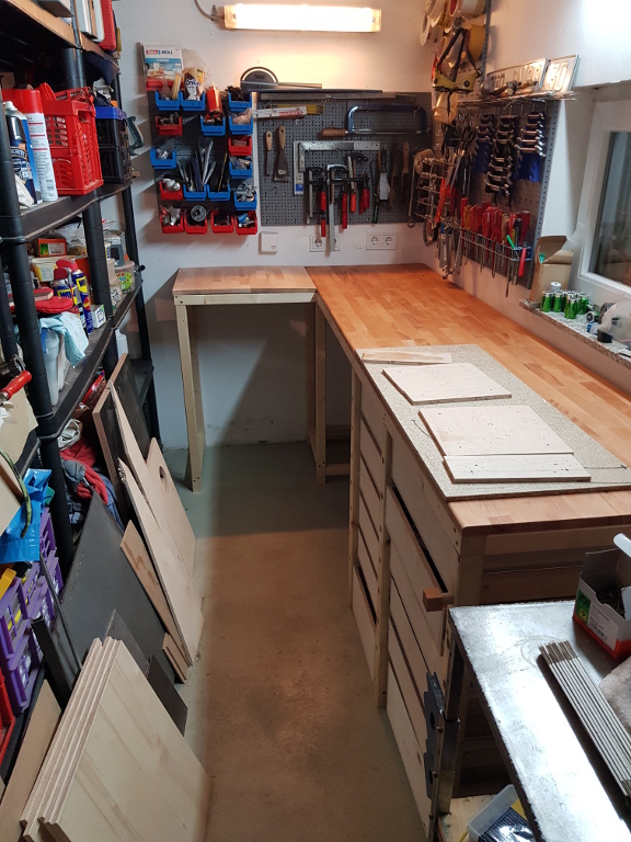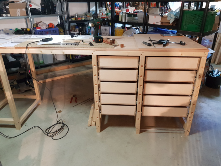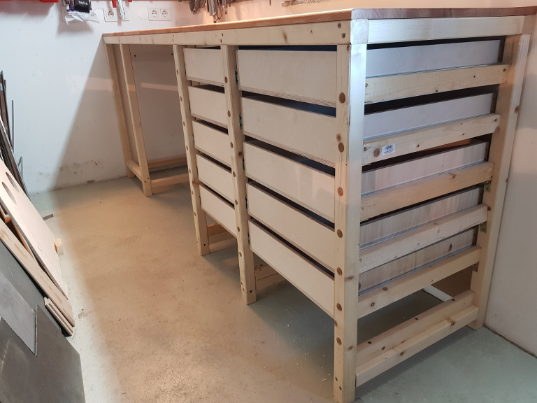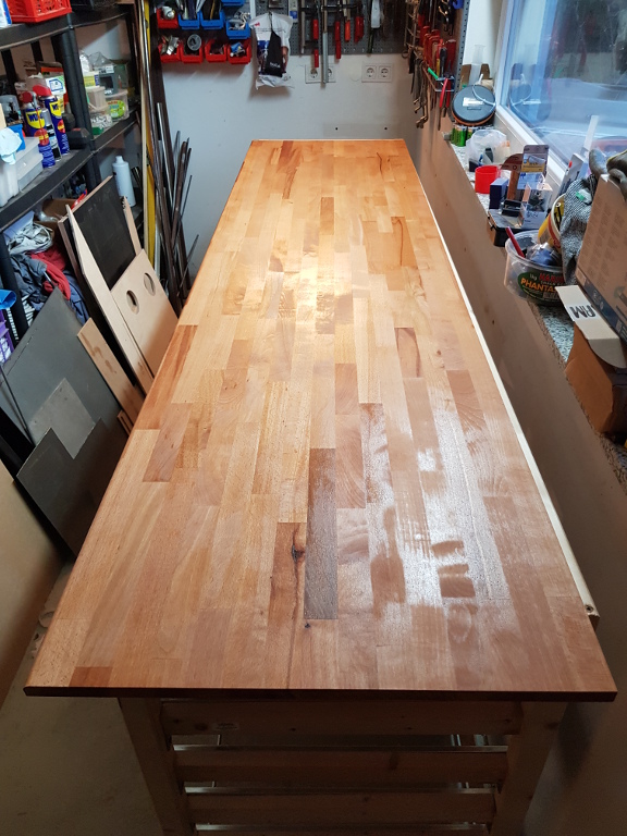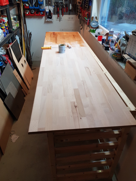 Dann wurde die (halbfertige) Werkbank schon mal an die endgültige Position geschoben. Man sieht, die Arbeitsplatte ist noch nicht fest verschraubt. So lässt sie sich besser mit Hartöl behandeln.