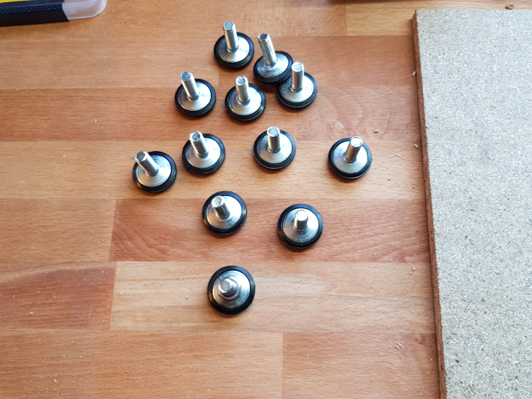Damit die Werkbank auch entsprechend gerade ausgerichtet werden kann, kommen einstellbare Füße zum Einsatz. Die Pfosten waren ja zu Beginn mit Einschlagmuttern versehen worden, um Füße zu verschrauben.