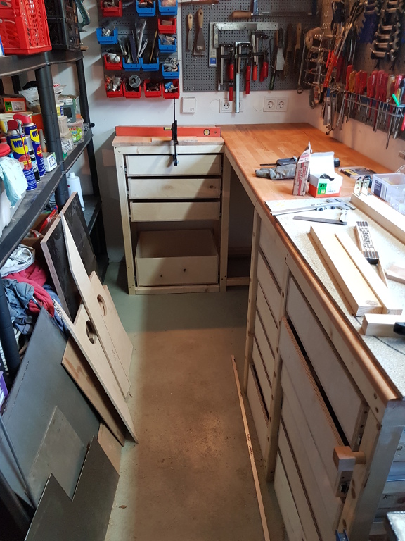 Die Schubladen für den Eckbereich sind auch in der "Mache". Da sich die Platte etwas verzogen hatte, musste mit Spannvorrichtungen nachgeholfen werden. Die Platte sind jeweils von unten verschraubt.