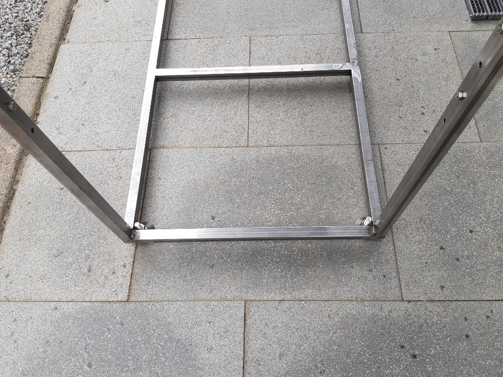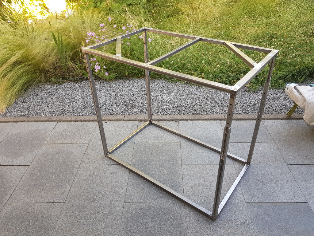 Hier schon mal das Grundgestell. Der Rahmen für die Tischplatte wurde jedoch noch mit weiteren Streben verstärkt, damit sich die Platte bei der entsprechend hohen Belastung nicht durchbiegt.