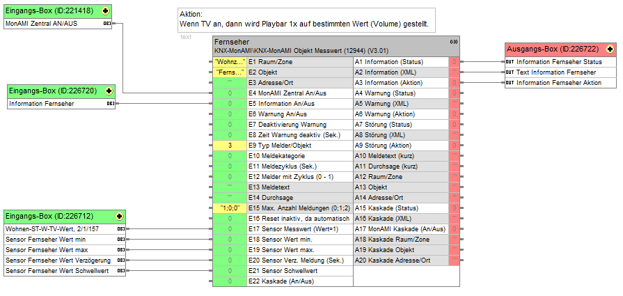 Mittels des Messwert-Baustein lässt sich der Betrieb des SmartTVs ermitteln und über den Aktions-Ausgangs der Startwert der Lautstärke auf einen vordefinierten Wert einstellen. Auf diese Weise werden die Hall-Effekte nahezu vollständig eliminiert.