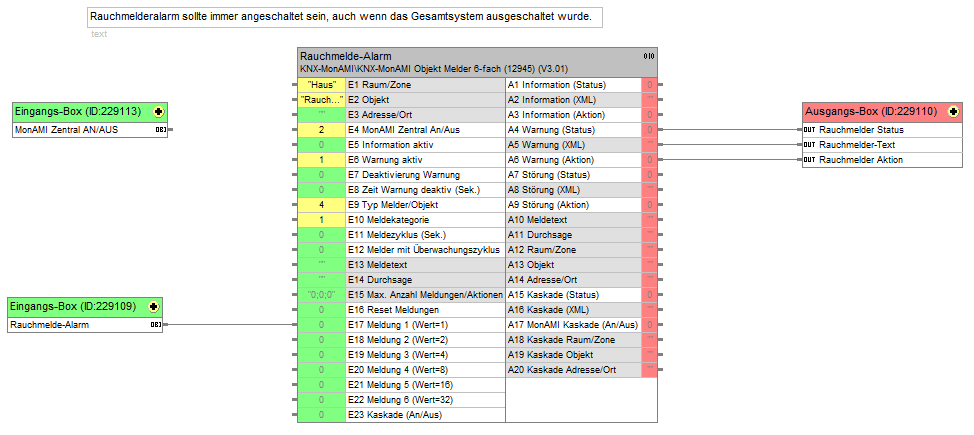 Die Konfiguration des Bausteins ist so, dass derartige Funktionen nicht ausgeschaltet werden können und immer aktiv sind, egal ob das System selbst aktiv ist oder nicht! Sicherheit geht vor!