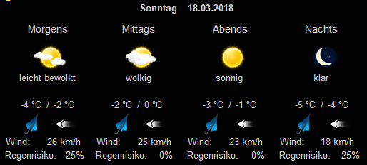 Das aktuelle Wetter kann direkt zentral angezeigt werden, die Vorausschau der nächsten Tage an anderer Stelle mit weiteren Informationen und/oder Wetterkarten usw. dargestellt werden.