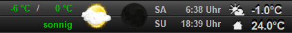 Gleichzeitig können auch die aktuelle Temperatur, aktuelles Wetter, Mondphase, Sonnenaufgang (SA), Sonnenuntergang (SU) usw. an zentralen Stellen auf die Visu gelegt werden.