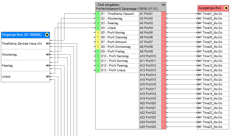 Die folgenden Bilder zeigen von mir entwickelten Bausteine für den HS3/HS4 für die Definition von Zeitprofilen und Szenensteuerungen. Der Zeitanzeige-Baustein unterstützt Wochentage sowie die vom Homeserver bereitgestellte Urlaubs- und Feiertagsfunktion.
