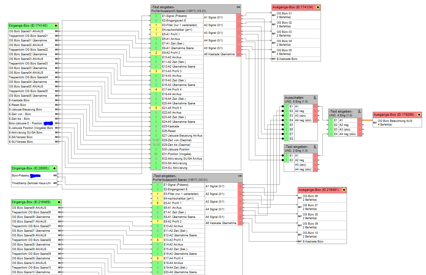 Bsp. gibt es eine sog. "Vollbeleuchtung" bei der alle Lampen im Haus angeschaltet werden und die Präsenzmelder gesperrt werden, damit sie keine individuelle Beleuchtung mehr aufrufen.