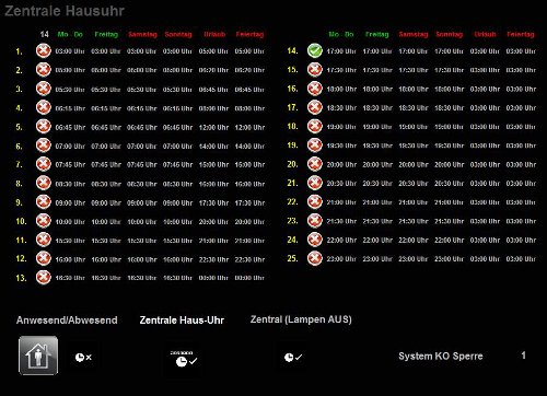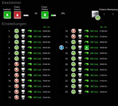 Zu all diesen Zeiten soll eine individuelle Beleuchtung mittels verschiedener Lampen und Dimmstufen erstellt werden und dann entsprechend automatisch abgerufen werden.
