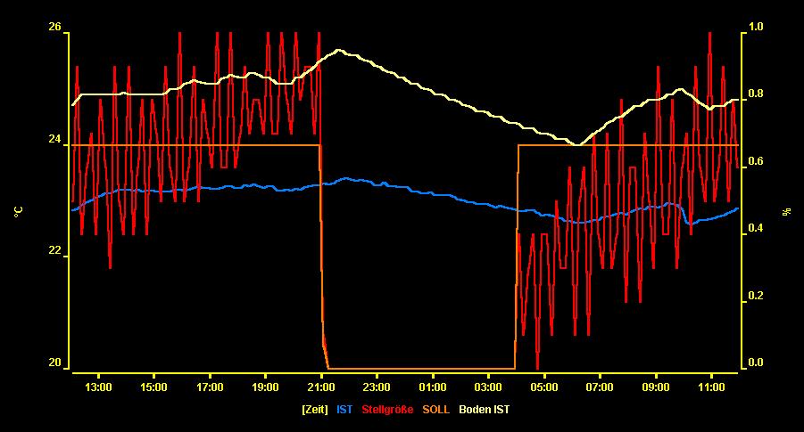 Die Abbildung veranschaulicht die Einzelraumtemperaturregelung (Soll-Temperatur, Stellgröße der Heizungsventile, Ist-Bodentemperatur, Ist-Lufttemperatur) in einem Zimmer mit Fußbodenheizung über einen Zeitraum von 24 Stunden. Die Gesamttemperatur wird anteilig aus der Boden- (60%) und Lufttemperatur (40%) berechnet. Anhand der Abbildung lässt sich die Trägheit der Fußbodenheizung sehr gut erkennen. Obwohl zwischen 12:00 und 21:00 Uhr geheizt wird, steigt die Gesamttemperatur (blaue Kurve) nur um ca. 0,5°C. Genauso fällt die Temperatur nur um ca. 0,5°C zwischen 21:00 und 04:00 Uhr, obwohl gar nicht geheizt wird.